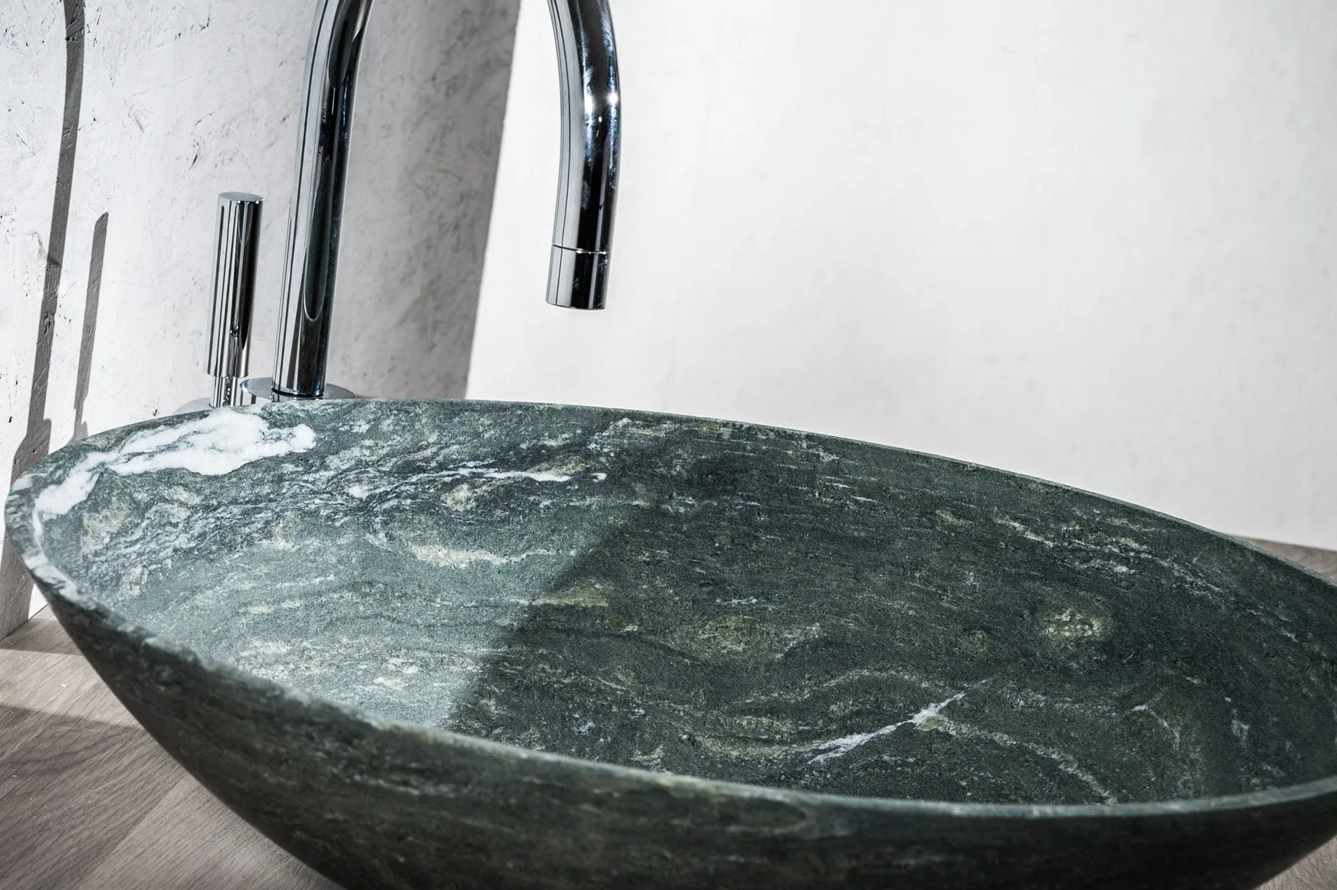 Das Waschbecken aus Naturstein besticht durch die geringe Materialstärke und unterstreicht so die ästhetische Form. Das Aufsatzwaschbecken hat einen Durchmesser von 40 cm und eine Höhe von 12 cm. Adanna ist erhältlich in Marmor oder Granit.